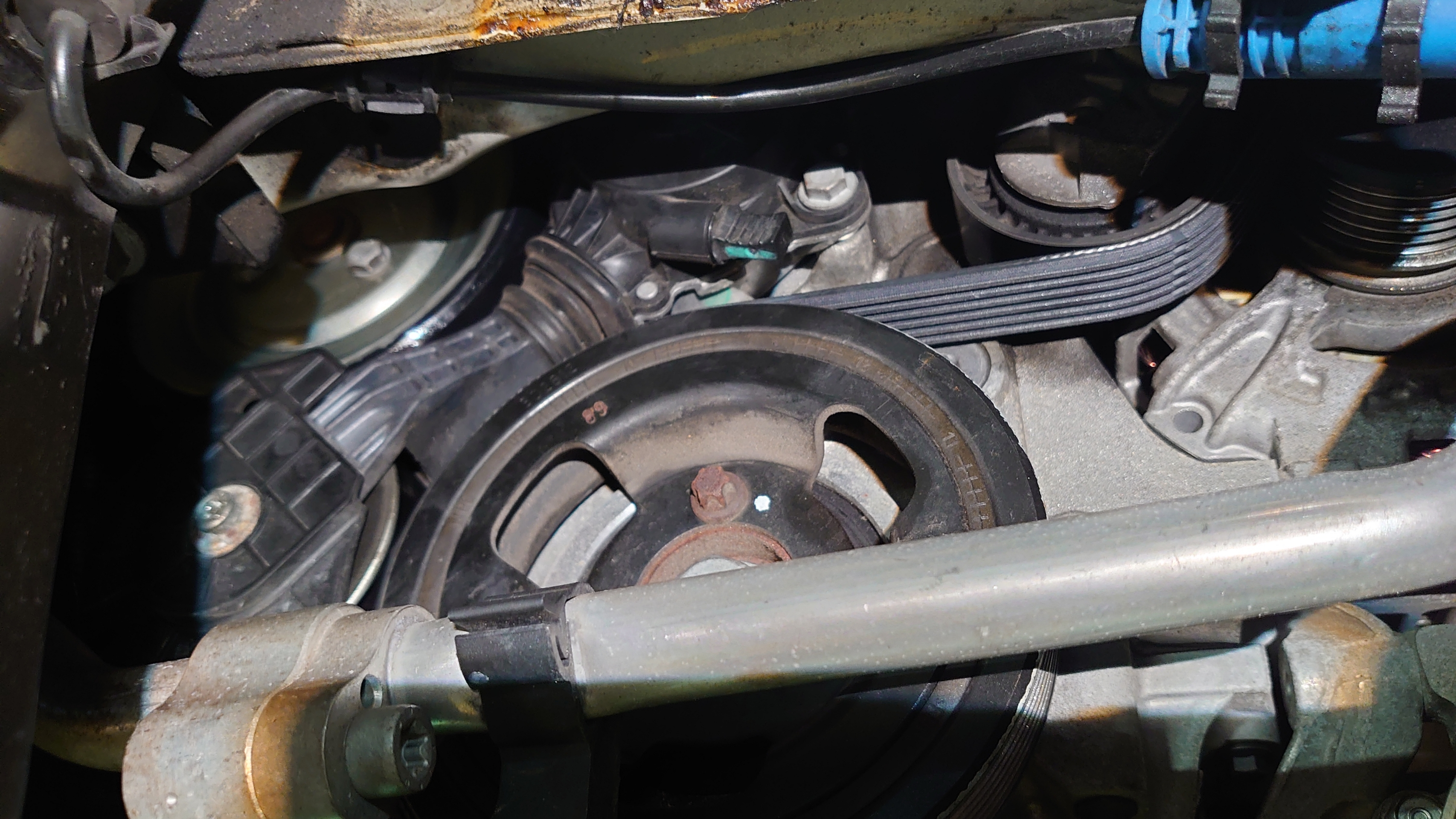 その後は、ウォーターポンププーリーがヒビヒビにて交換。R56〜の方は、ほぼなる症状なので、ゴム部が剥がれちゃう前にクラックが入って来たら交換しましょう〜