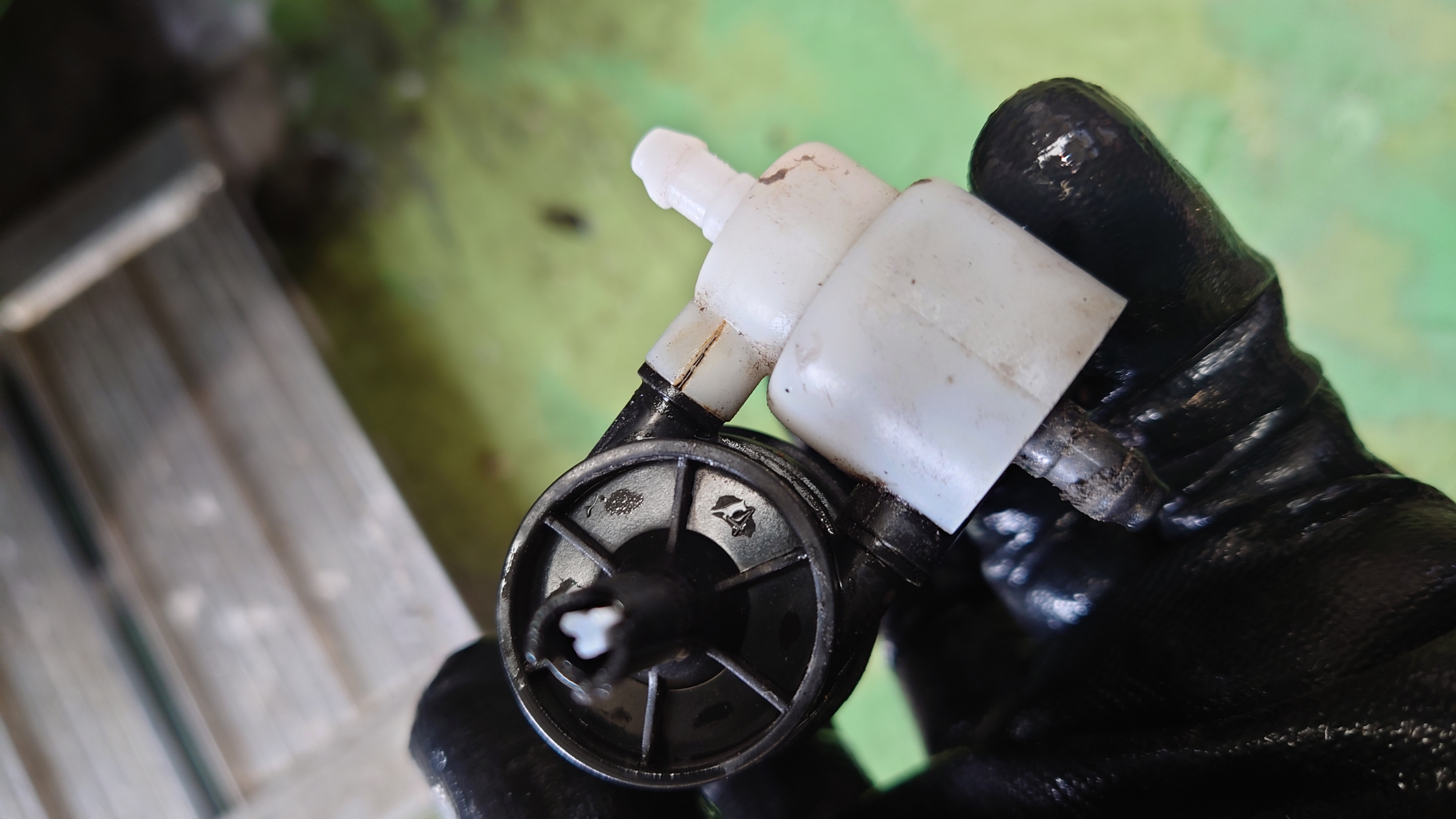 そして停車中に、フロントバンパーの運転席側から水が垂れていましたので、点検するとウォッシャーモーターのクラックでウォッシャー液漏れが起こっていましたので、ウォッシャーモーターを交換させていただきました。