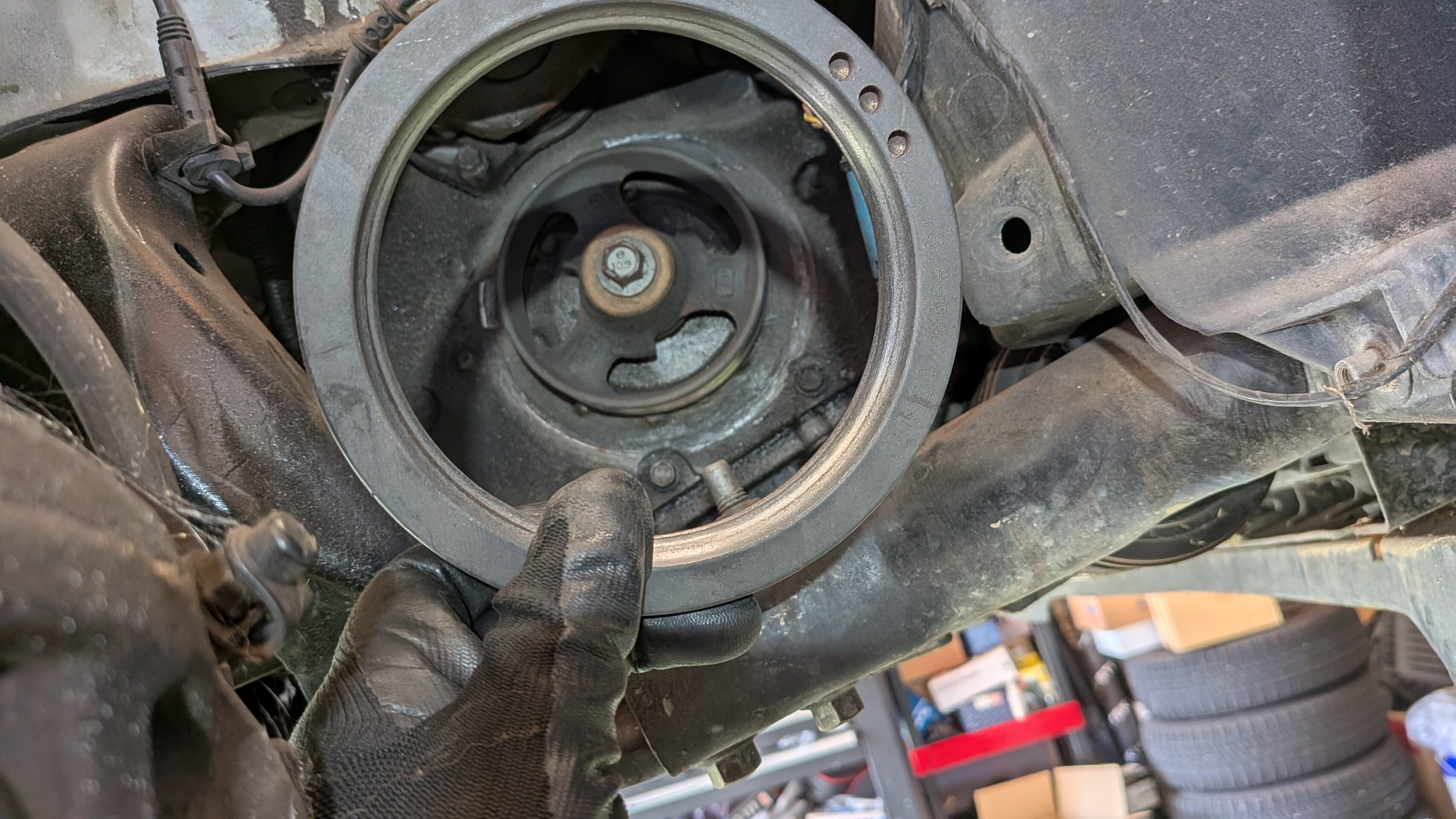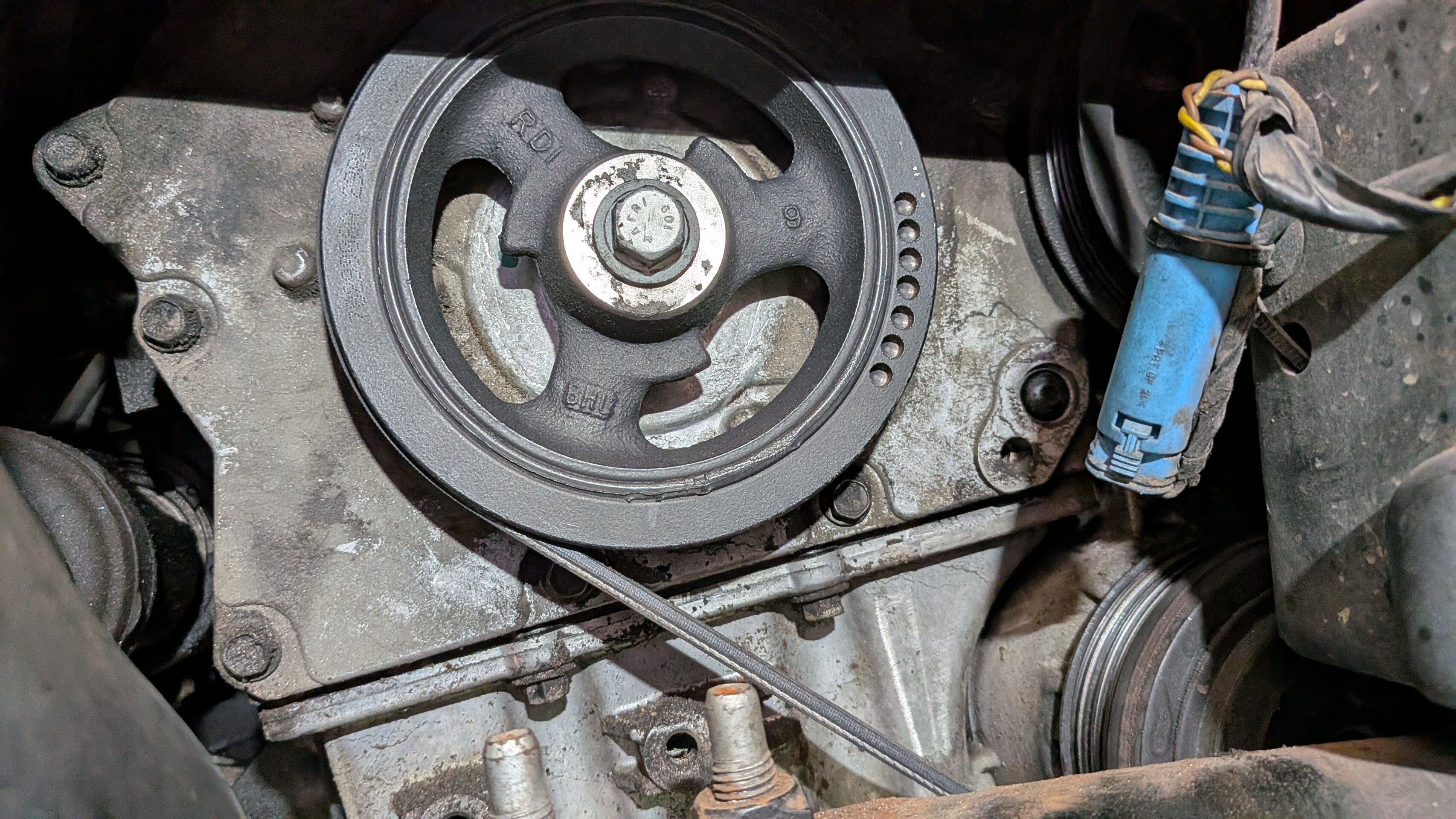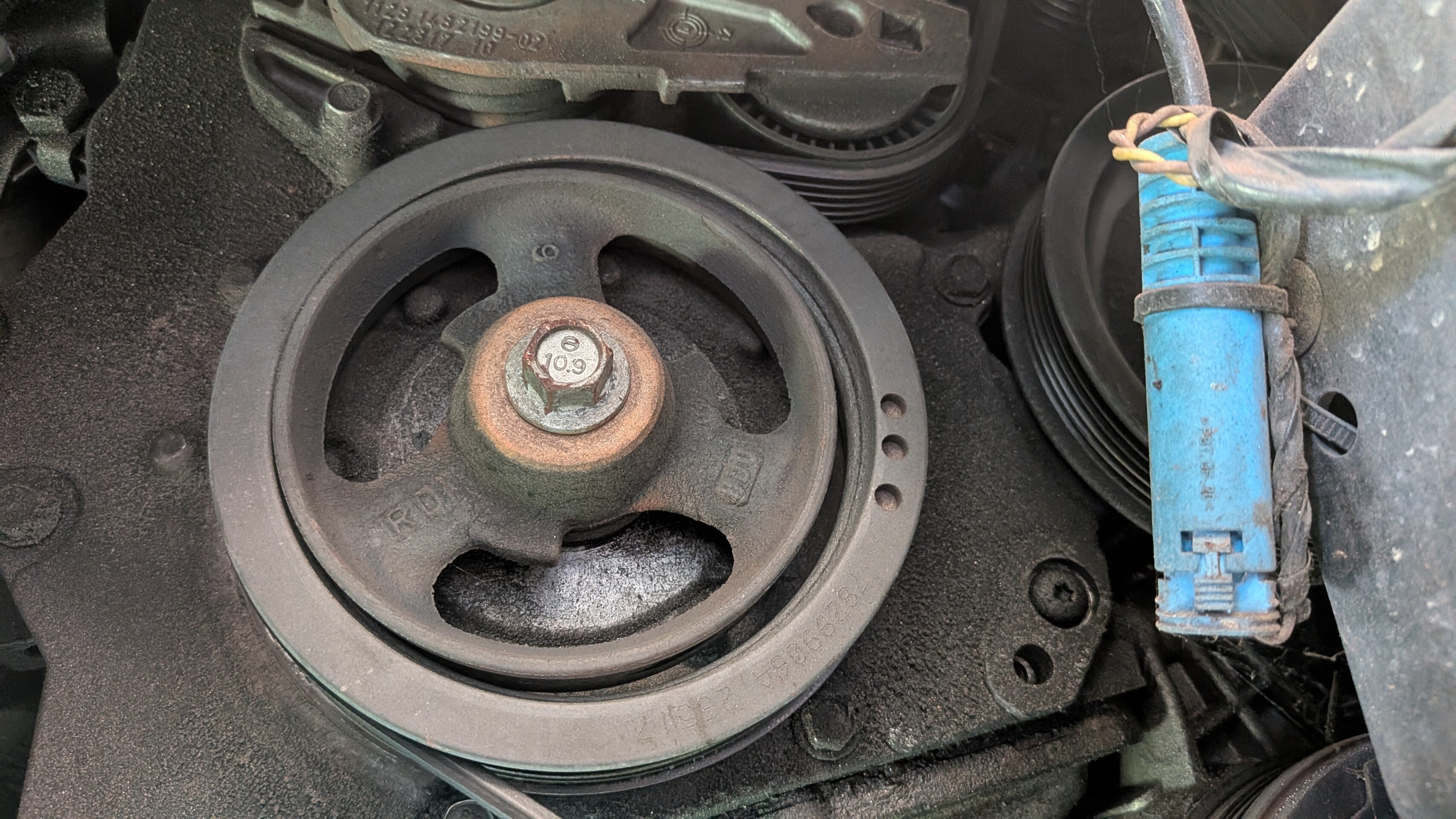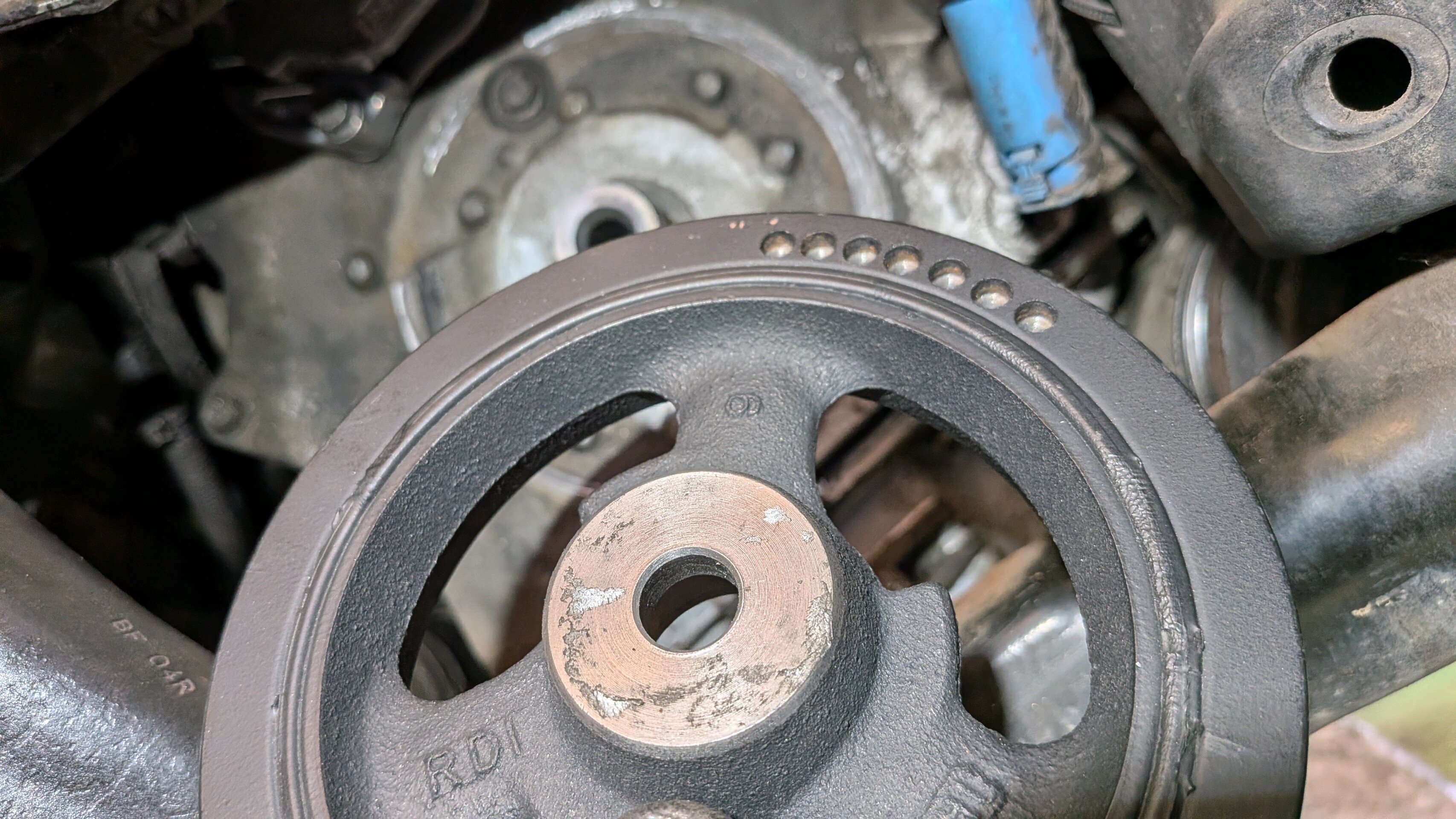 点検すると、、、クランクプーリーのダンパー部が綺麗に剥がれてました。