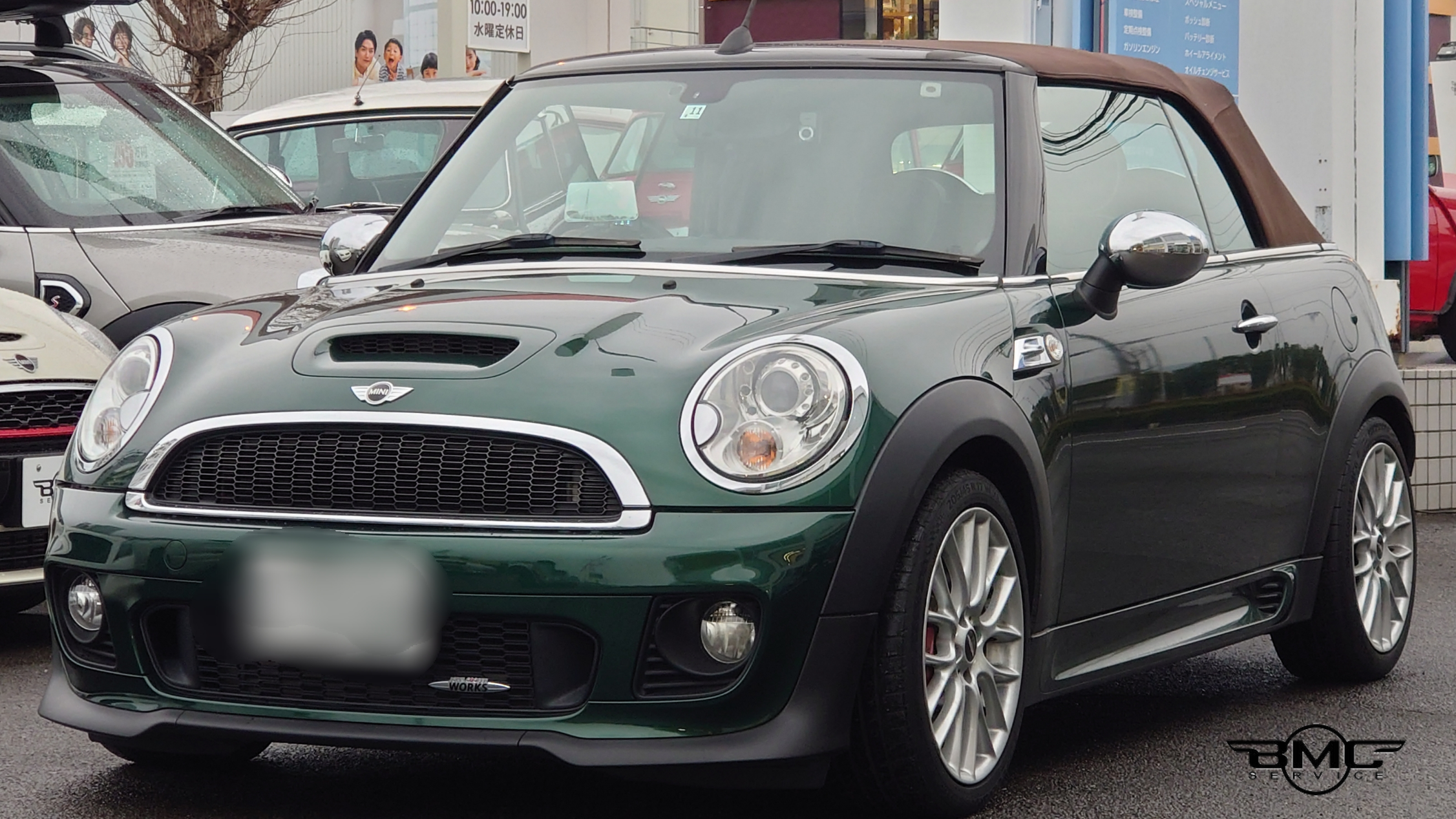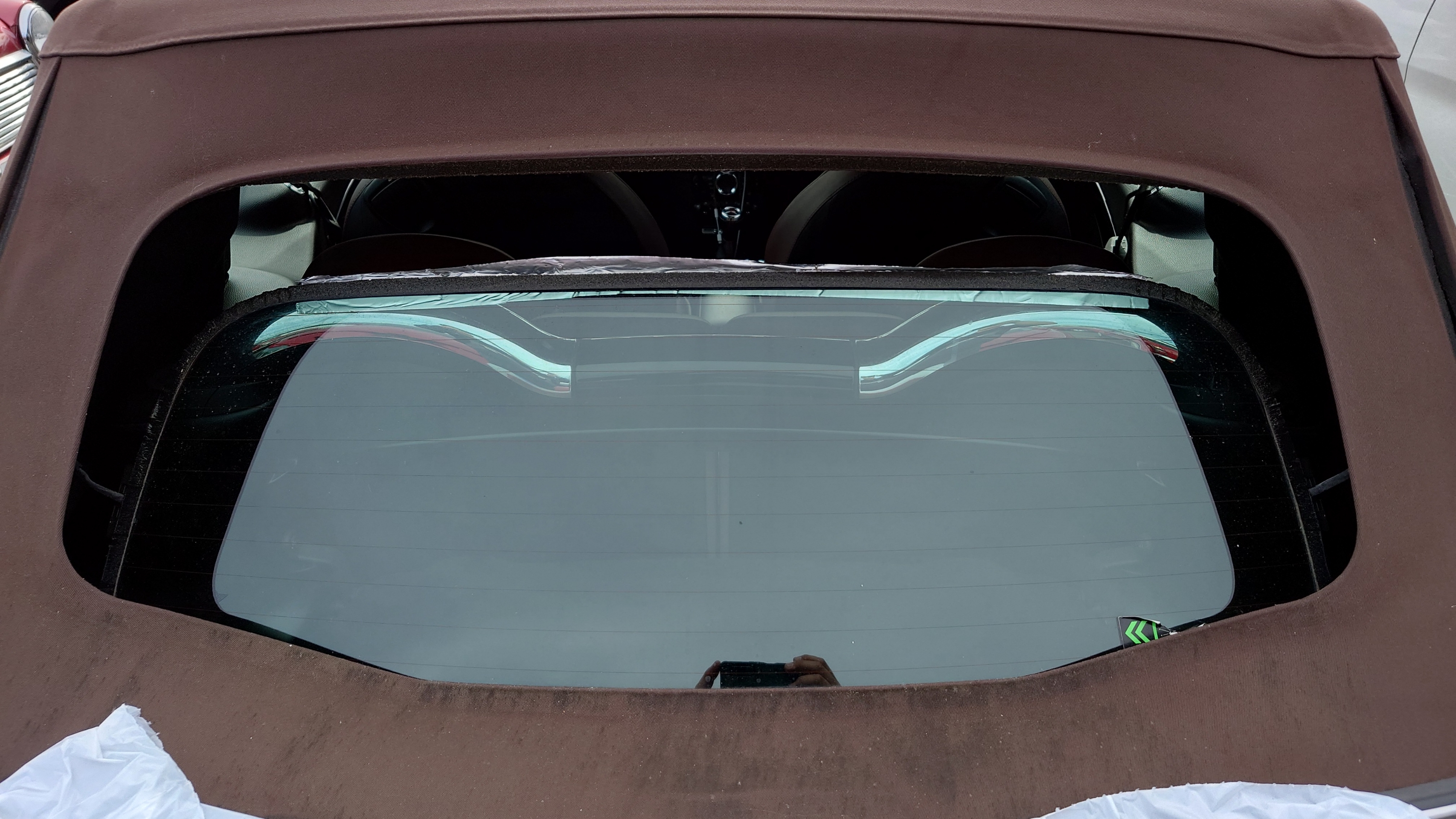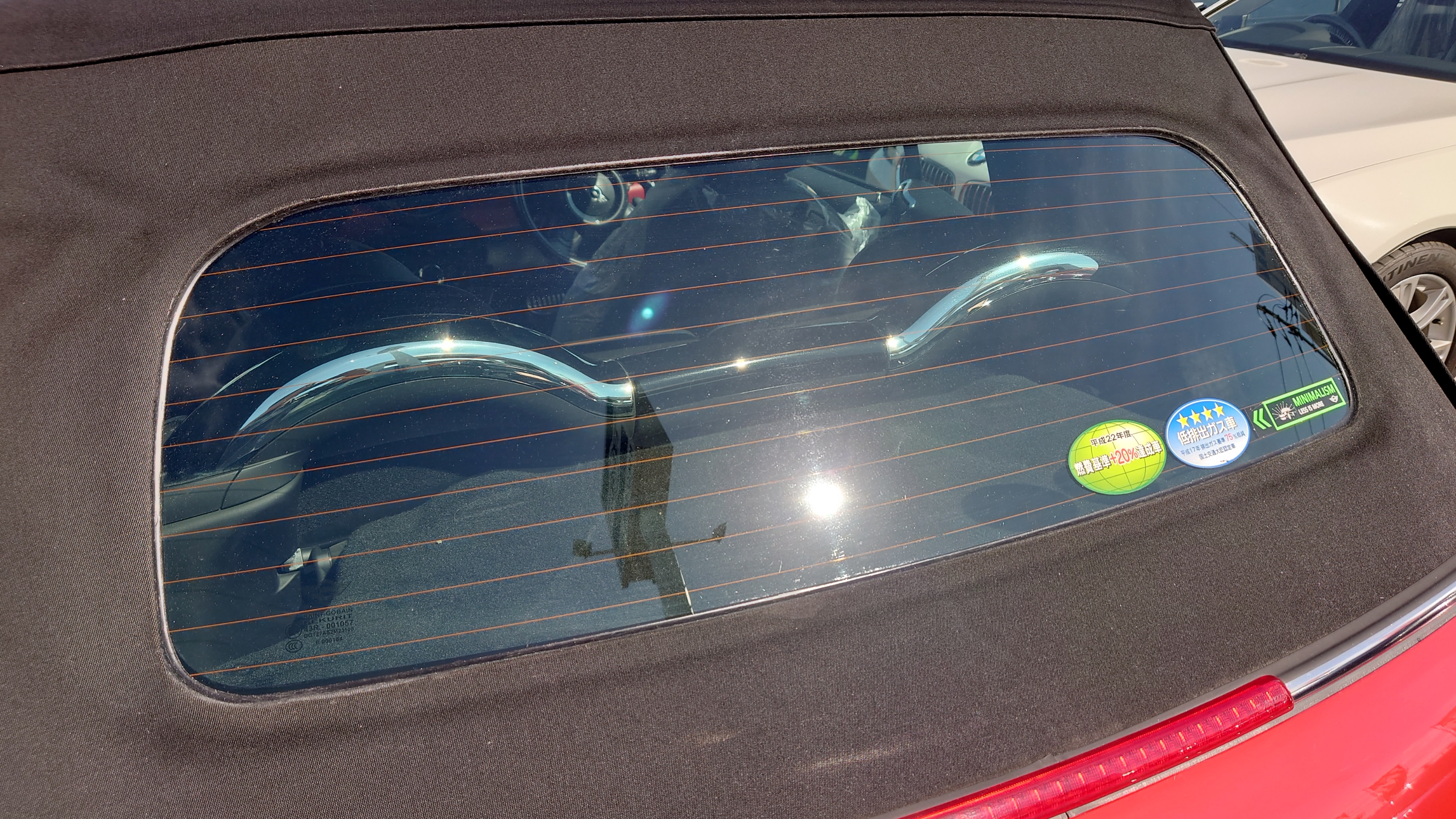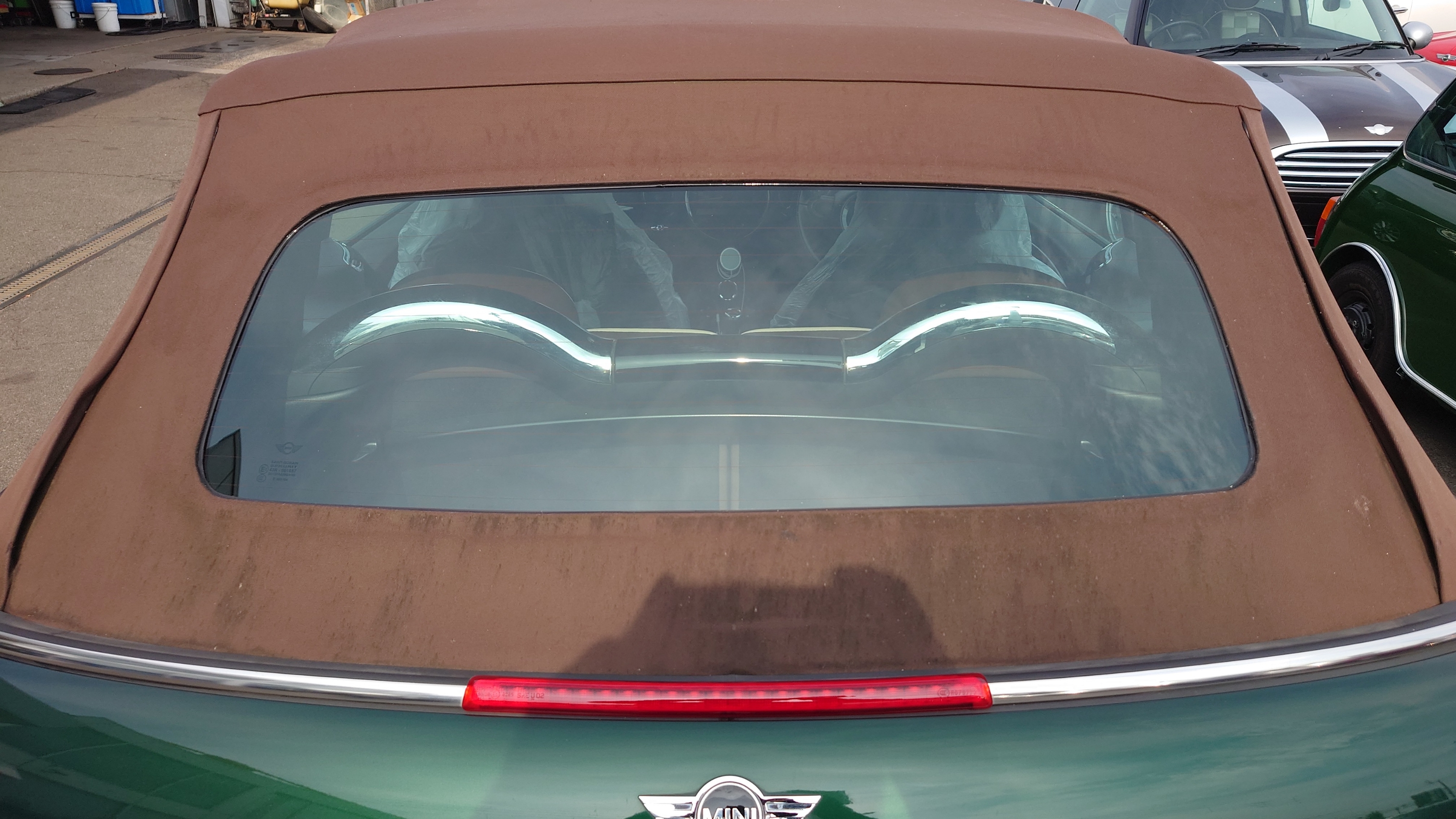 R57 BMWミニ コンバーチブル クーパーの幌のガラスが。。。にて御入庫です。( ̄▽ ̄)ゞ