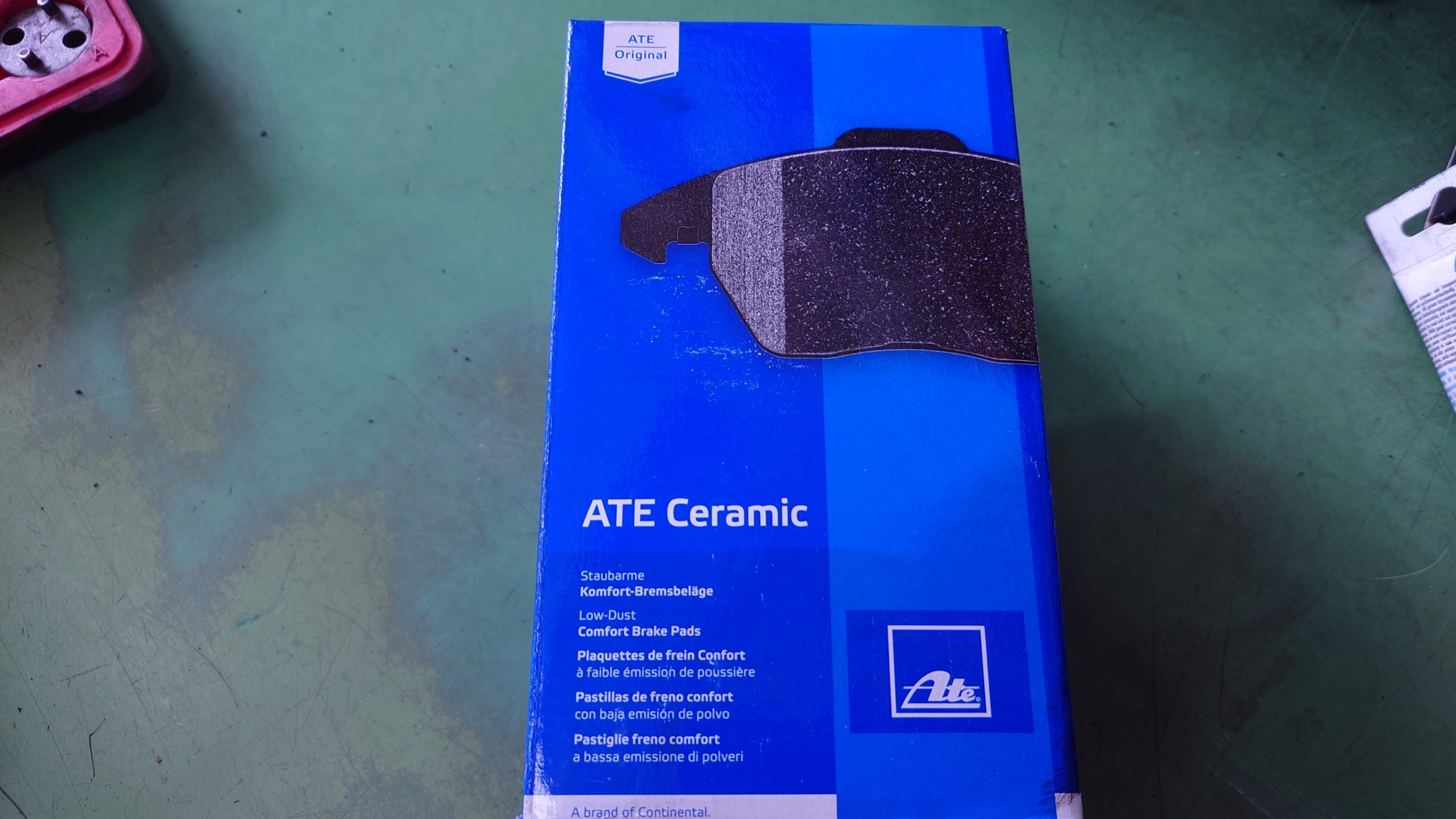 ブレーキパッド残量の警告が出ておりましたので、今回もATEのセラミックパッドにて交換。